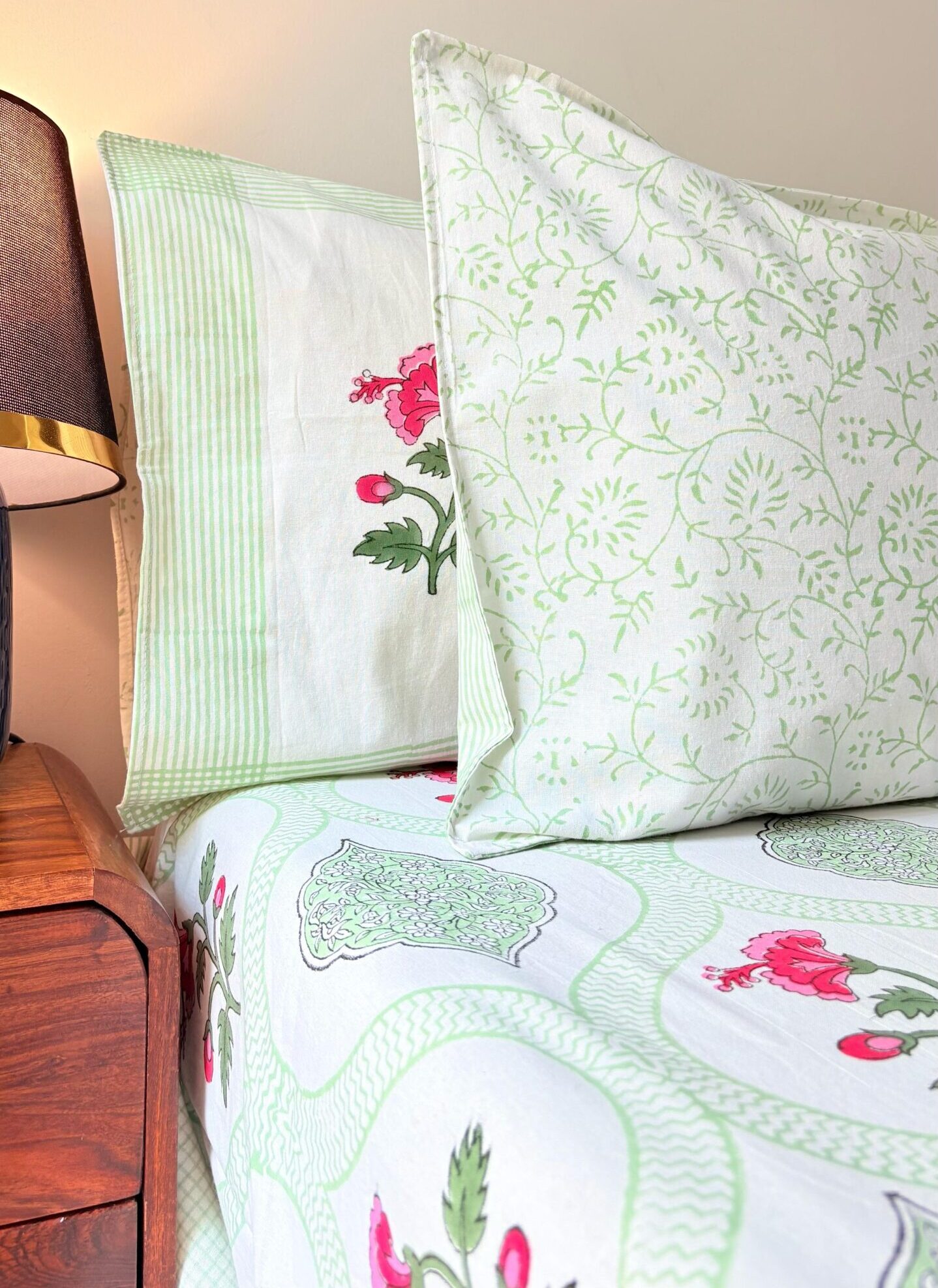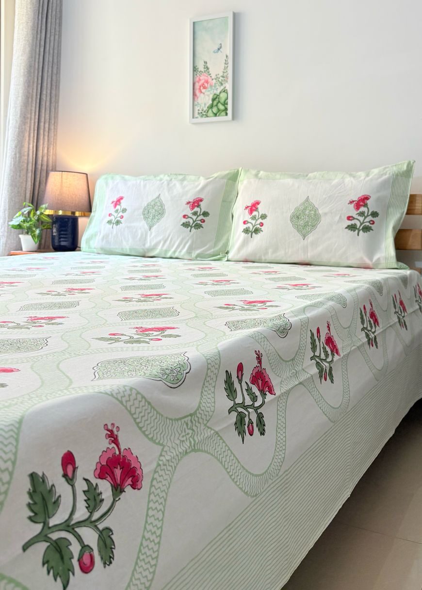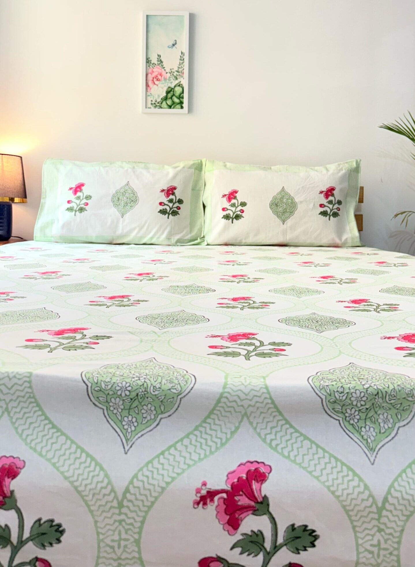 Subtle greens, bold pinks, and traditional block printing come together in Gudhal Bageecha, our premium king size bedsheet. Inspired by blooming hibiscus (gudhal) flowers and trailing vines, this design adds calm elegance and handcrafted charm to your bedroom.