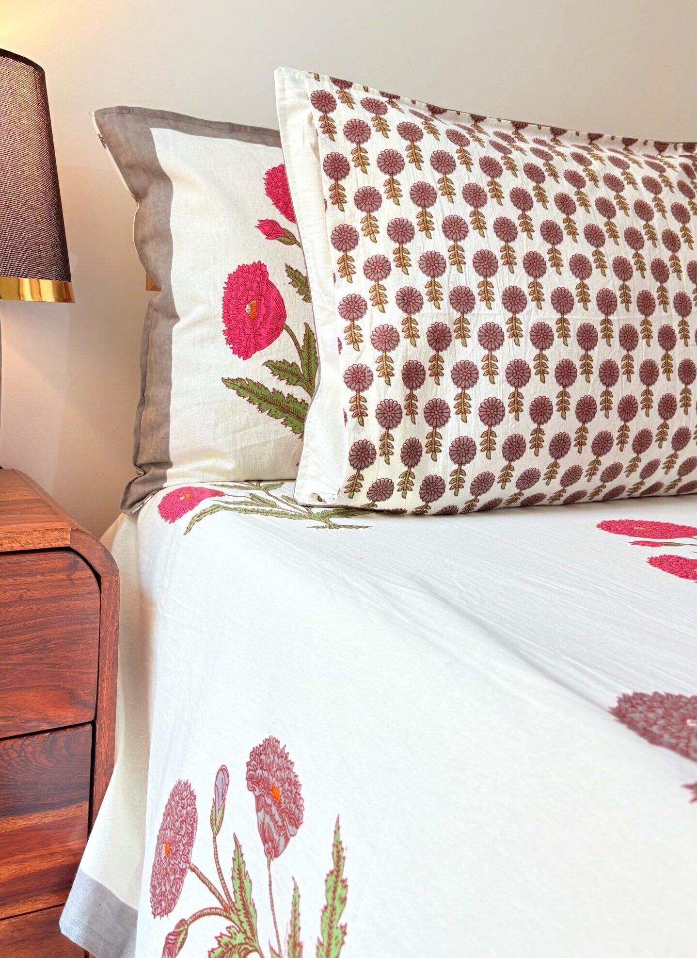 Add earthy elegance to your bedroom – a handcrafted cotton bedsheet featuring deep red floral prints and soothing tones. Crafted with care for comfort and charm.