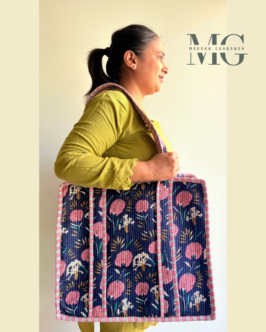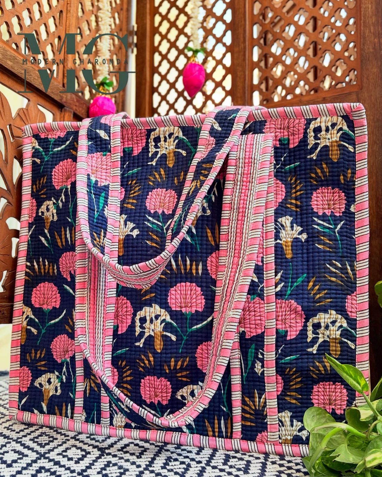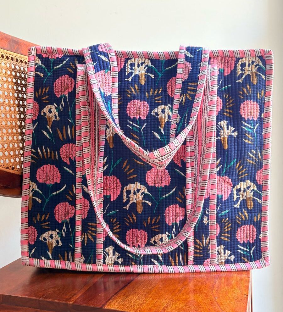 Crafted from 100% block printed cotton fabric, this large-sized tote comes with a sturdy zip and an inner card-sized pocket to keep your essentials organized.
